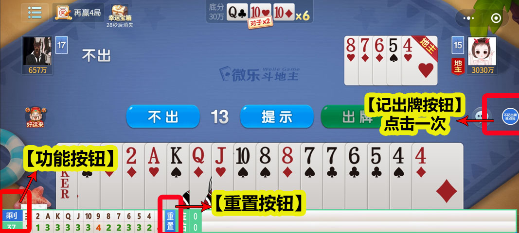 1、出牌前发现手牌没记准或新开局不重置,请点击一次【重置】按钮;